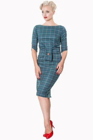 This dress has a boat neckline, three quarter length sleeves, belt detail, a pencil skirt with back slit and it fastens at the back with a zipper.