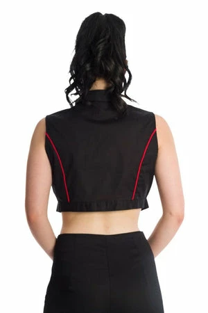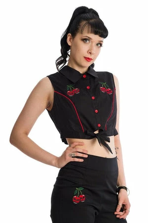 The sleeveless vintage shirt has deadly cherries embroidery, a high neckline, contrast button closure, waist tie detail and a figure accentuating fit.