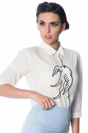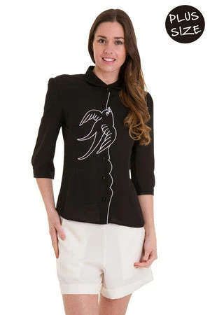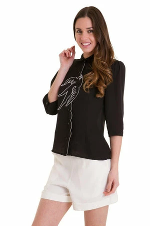 This sophisticated rockabilly top from Banned Apparel, is super flattering while making a stylish statement! The style is available in black, navy and white and is available in plus sizes also.