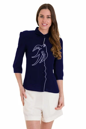 The vintage top has front and back bird print, a high neckline with collars, three quarter length sleeves and it fastens with buttons at the front.