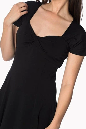 The maxi black dress has a sweetheart neckline, short sleeves, flared skirt and it fastens with a flattering fit.
