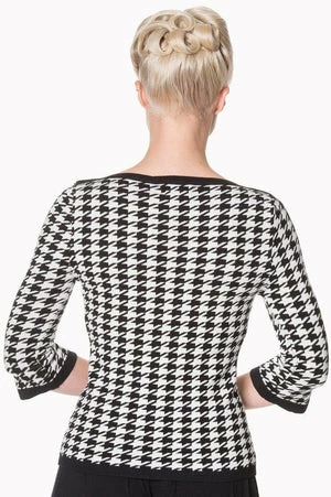 The top has an allover dog-tooth style pattern, a boat neckline and three quarter length sleeves with bow detail.