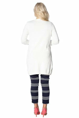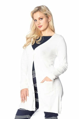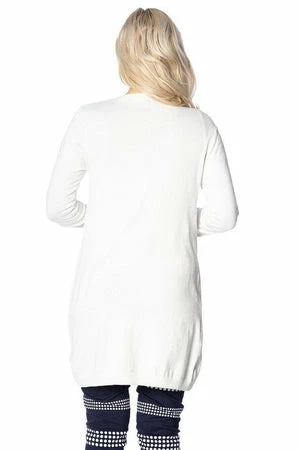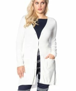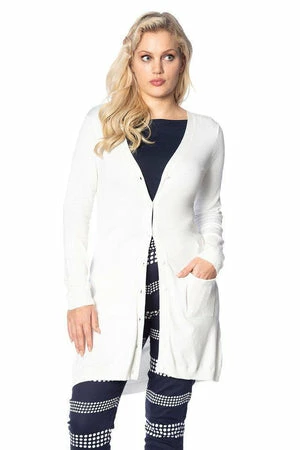 The white long cardigan has long sleeves, a V-neckline, a figure accentuating fit, ribbed cuffs and hem, pockets and it fastens with front buttons.