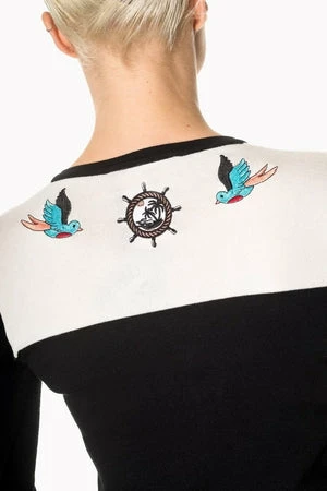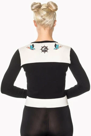 A phenomenal, retro style ladies cardigan, by Banned Apparel, the lock and key cardigan. This design is black and off-white, with embroidered ship’s wheels, anchors, flowers and bluebirds.
