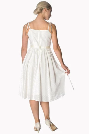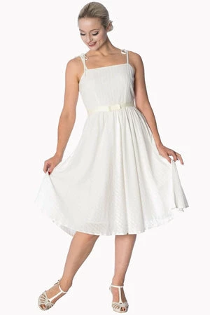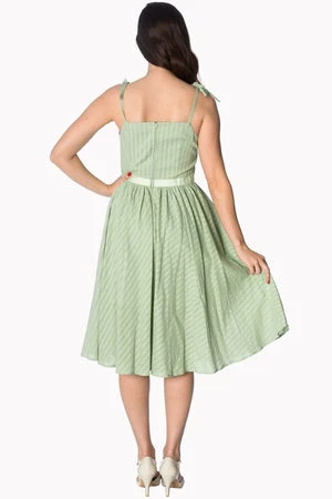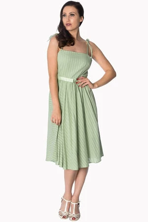 You’ll love this exceptional, rockabilly, ladies dress from Banned Apparel, available in pink, off-white and green. The style has spaghetti straps at the neckline, a matching waist ribbon tie and a flared skirt.