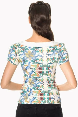 This is a spectacular, rockabilly, ladies short sleeve top from Banned, the “mandala top”, in beige with a retro birds and flowers print, beige collar and puff cap sleeves.