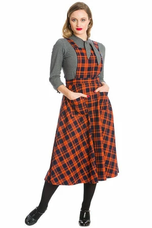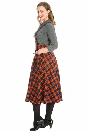 The vintage pinafore dress has checkered print, button detailing, front pockets, a figure accentuating shape and it fastens at the back with a zipper.