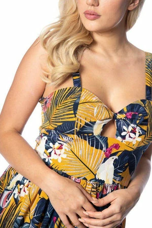 The vintage paradise dress has a sweetheart neckline, a figure accentuating shape, bow and keyhole cut-out detail and it fastens with a back zipper.