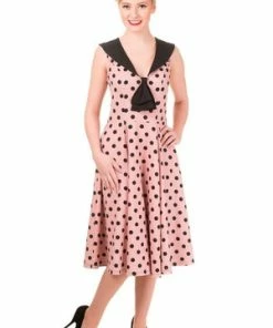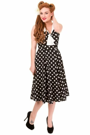 Show off your style in this retro “Rival” dress from Banned. Made from 100% polyester with an all over polka dot print and a contrasting collar and neck tie. Available in black or pink.