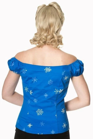 You’ll love this fantastic, rockabilly, ladies short sleeve top by Banned Apparel, the romance lives off shoulder top, in blue with a snowflakes print.