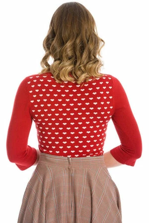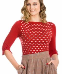 The vintage top has appealing hearts design, a round neckline, three quarter length sleeves and a figure accentuating shape.