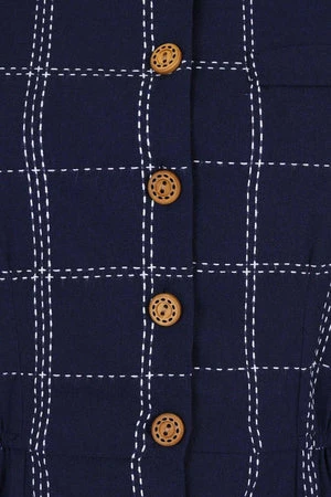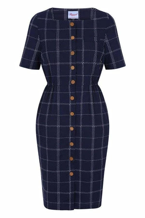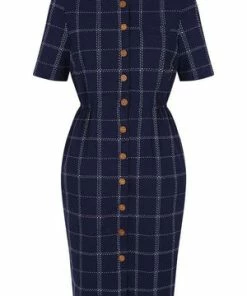 The off shoulder dress has a square neckline, short sleeves, a figure accentuating shape and it fastens with buttons at the front.