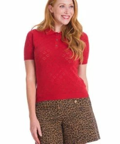 The vintage top has pointelle heart design, high neckline, short sleeves, a figure accentuating fit and it fastens at the front with buttons.