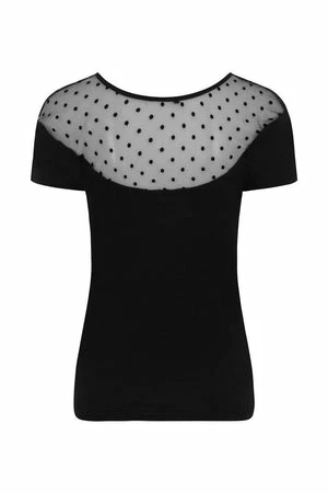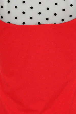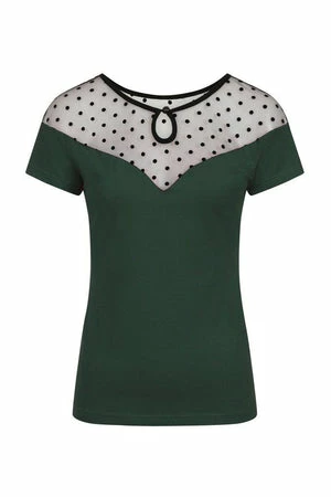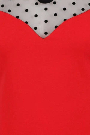 The vintage top has polka dots design, a round neckline, front keyhole detail, short sleeves and a figure accentuating fit.