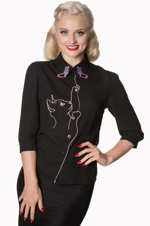 The style features a high neckline, three quarter length sleeves and fastens with buttons at the front. The design features an embroidered front cat crawling up the buttons to chase the butterflies on the collar and an embroidered back cat and butterflies detail.