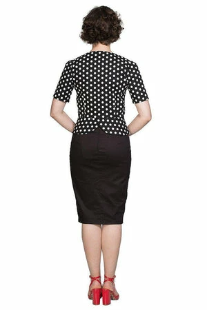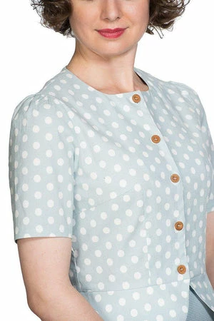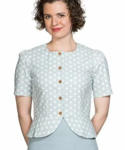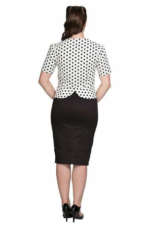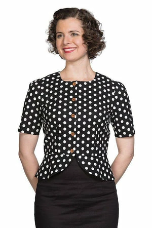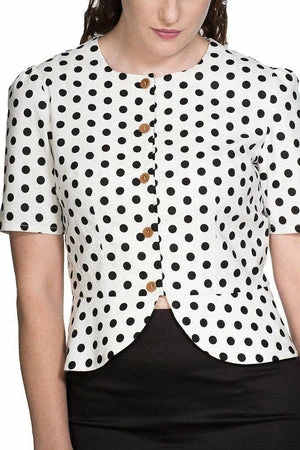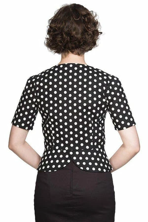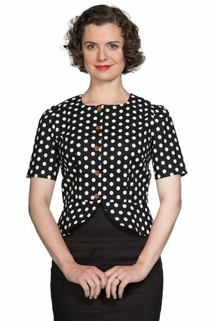 The vintage peplum top has polka dots print, a crew neckline, short sleeves, hem detailing, a flattering shape and it fastens with buttons at the front.