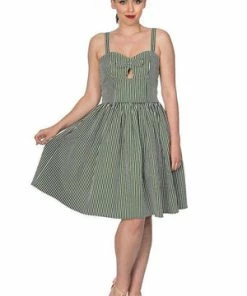The vintage dress has a striped design, keyhole detail, a sweetheart neckline, pleats detail, a flattering fit and it fastens with a hidden back zipper.