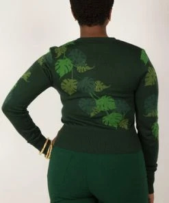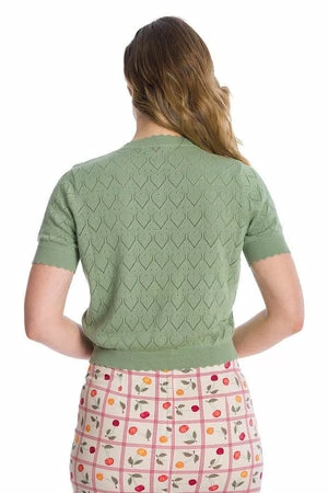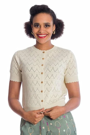 The retro cardigan has scalloped embroidery design, a round neckline, ribbed hem and cuffs, short length sleeves and it fastens at the front with buttons.