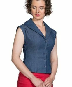 The denim blouse has a V-neckline, a figure accentuating shape and it fastens with buttons at the front.