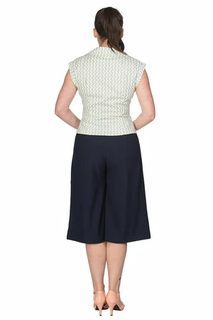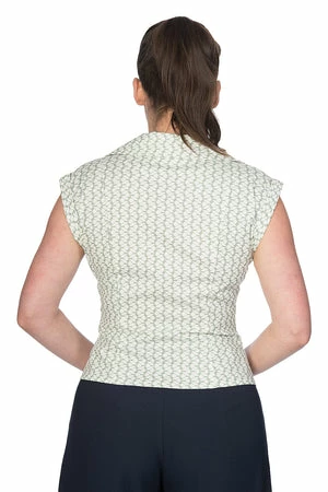 The blouse has a V-neckline, allover tile design, short capped sleeves, a figure accentuating shape and it fastens with matching buttons at the front.