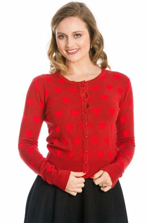 The vintage cardigan has allover hearts print, crew neckline, ribbed hem and cuffs, full length sleeves and it fastens at the front with glossy buttons.