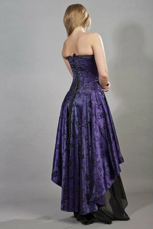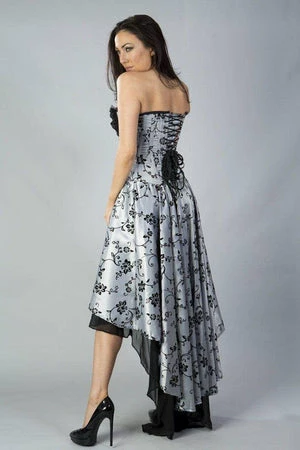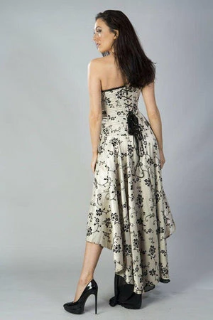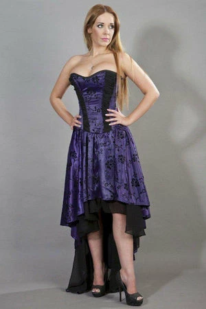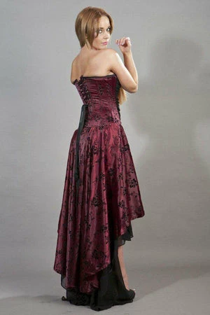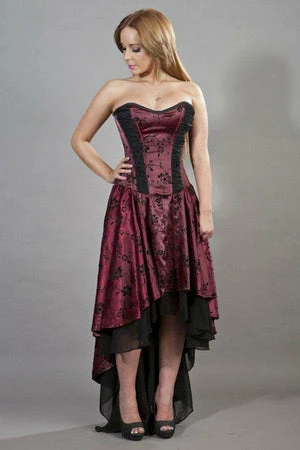This high low, satin, Valerie Victorian corset dress has black floral flock, laces detailing, ruffled black georgette front panels and back lace fastening with modesty panel.