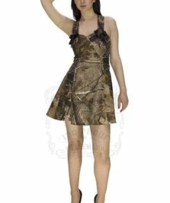 The sleeveless non-stretch dress has Camouflage print, halterneck and a figure accentuating shape.