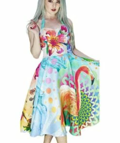 The sleeveless non-stretch dress has watercolour flowers and flamingo print, halterneck, full circle skirt and a figure accentuating shape.
