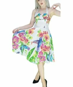 The sleeveless non-stretch dress has hummingbirds, parrots and flowers print, a halterneck, a full circle skirt and a figure accentuating shape.