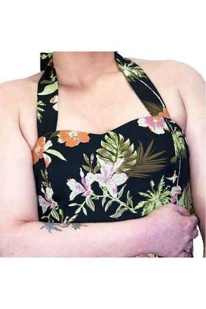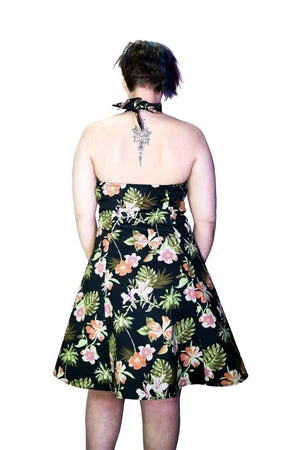 The sleeveless non-stretch, black swing dress has colourful flowers and palm trees print, a sweetheart neckline, halterneck tie, full circle skirt and a figure accentuating shape.