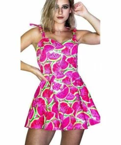 The sleeveless non-stretch summer mini dress has pink watermelon 3D print, a sweetheart neckline, full circle and a figure accentuating shape.