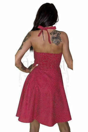The sleeveless non-stretch red dress has polka dots print, halterneck tie and a figure accentuating shape.