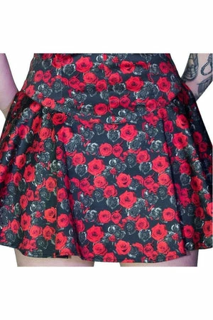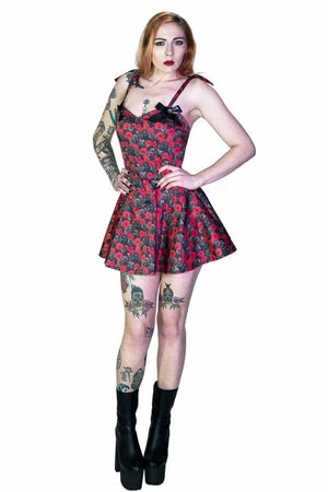The sleeveless stretchy, mini dress has red and grey roses print, tied straps and a figure accentuating shape.
