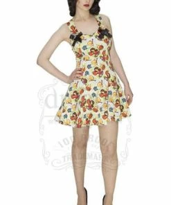 The sleeveless stretchy, mini dress has red apples and dolls print, halterneck tie and a figure accentuating shape.