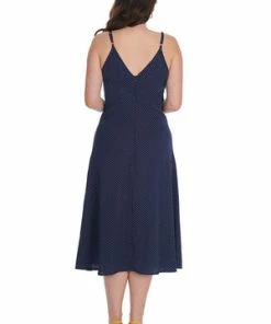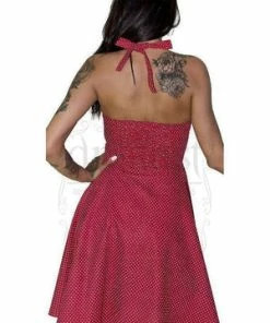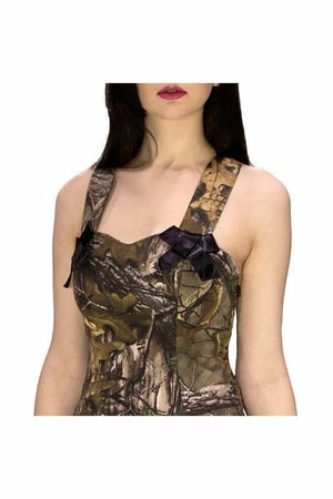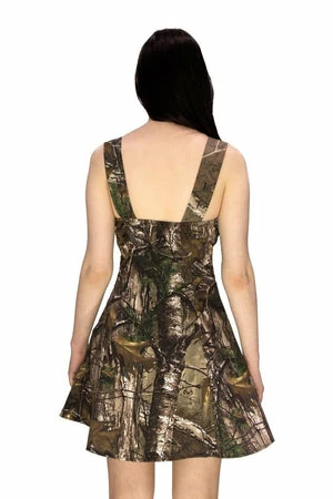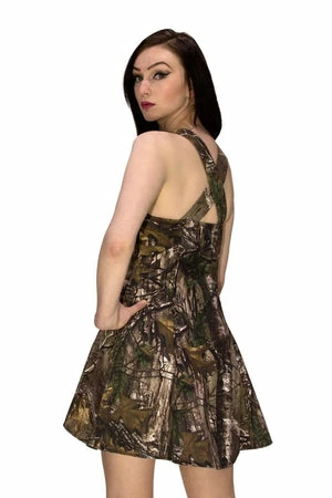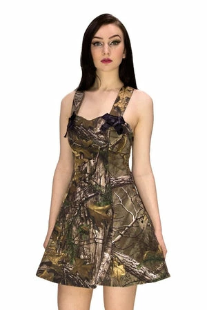 The sleeveless non-stretch, ripstop dress has camouflage print, halterneck tie, a sweetheartneckline and a figure accentuating shape.