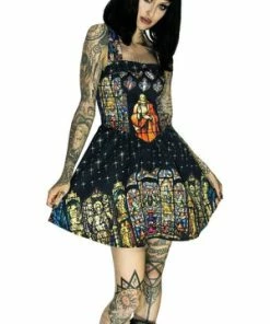 The technical stretchy, midi dress has Christ themed print, halterneck tie, cross or straight straps, a figure accentuating shape and it fastens with a zipper.