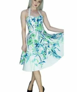 The sleeveless non-stretch, midi dress has green and blue print, a sweetheart neckline, halterneck tie, full circle skirt and a figure accentuating shape.