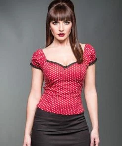 The red shirt has a white polka-dots design, a sweetheart neckline, short sleeves and a figure accentuating shape.