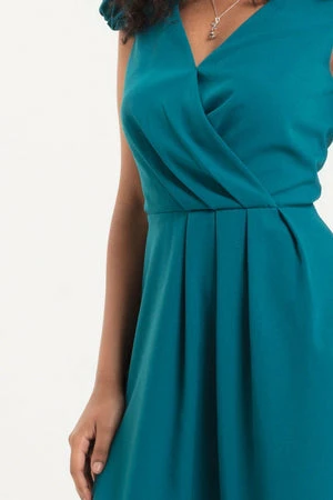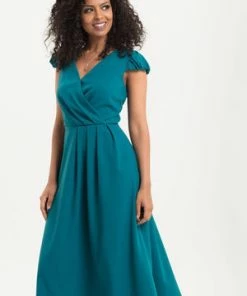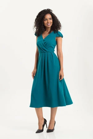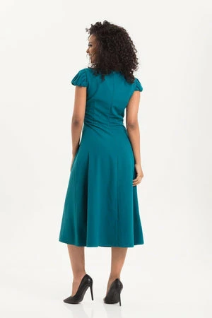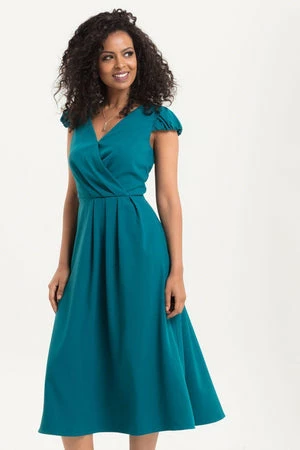 This A-line midi dress has a V-neckline, capped puff sleeves, subtle pleating detail at the waist, natural waistline and fastens at the back with a hidden zipper.