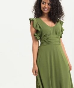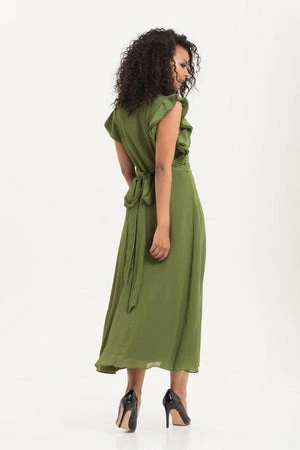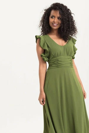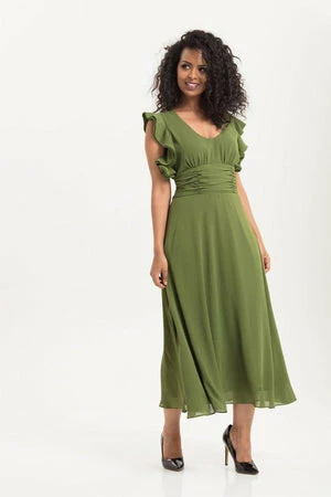 This A-line, midi dress has ruffled butterfly sleeves, a V-neckline, ruched waistline, waist bow and it fastens at the back with an invisible zipper.