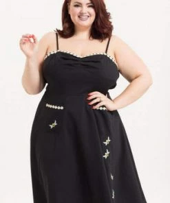 This design is black and features an adorable sweetheart neckline with white daisy trim, pleated bust and flared skirt. It can be adjusted with spaghetti straps and has smocking stitching at the back.