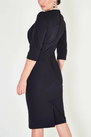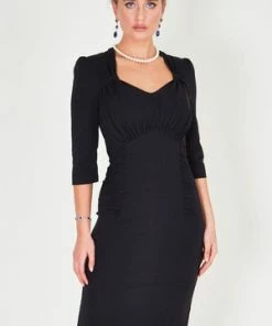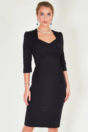 The midi dress has a sweetheart neckline, ruched bust, three quarter length sleeves, a flattering fit and it fastens with a zipper at the back.
