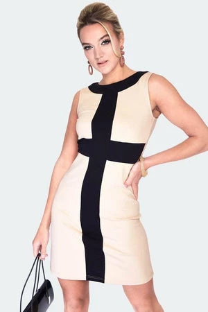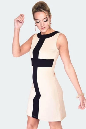This 60s style shift dress has a contrast stripe panel, a round neckline, flattering fit and it fastens with a zipper at the back.