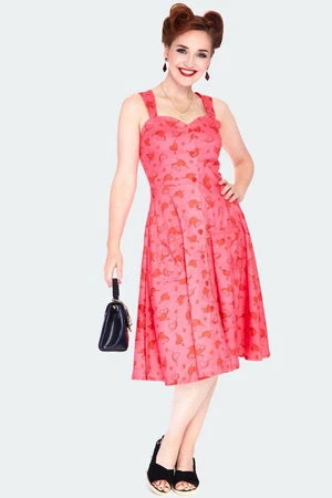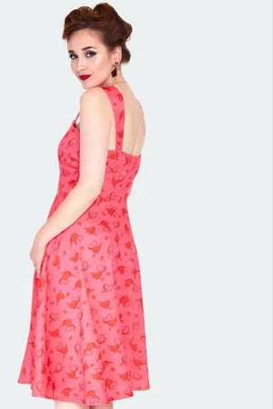 The retro flared dress has cupid hearts print, sweetheart neckline, neck tie detail, a flattering fit and it fastens at the front with a heart buttons.