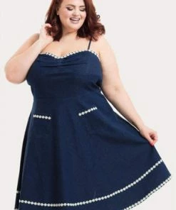 “Daisy May” is a lovely denim flared Rockabilly plus size dress from Voodoo Vixen, with captivating Daisies trim/hem detailing.