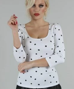 This vintage knitted top has polka dots print, scoop neckline, three quarter length sleeves and a flattering fit.
