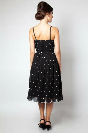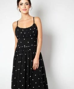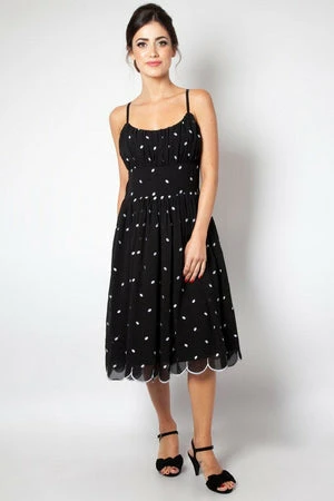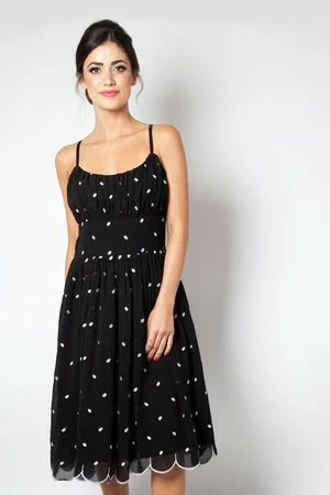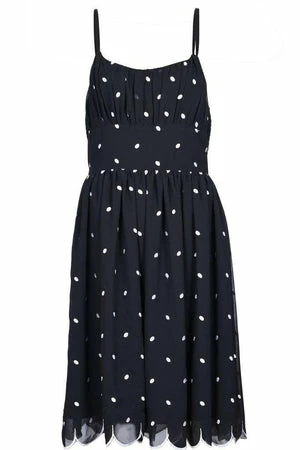 This sleeveless, midi dress has metallic thread contrast white polka dots, ruched bust, spaghetti straps, a round neckline, a flattering fit, scalloped skirt hem and it fastens at the back with a hidden zipper.