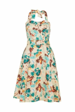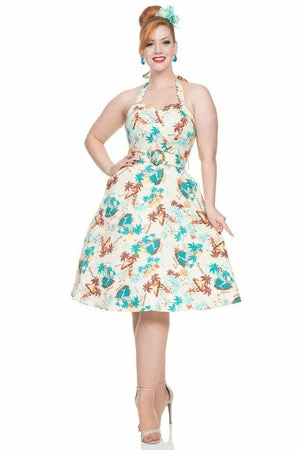 “Ella” is a quirky and appealing, Hawaiian style retro dress from Voodoo Vixen. The print is a spectacular mermaid and palm tree island print on a vintage super flared beige dress, the style has a sweetheart neckline, halter neck strap, matching belt with buckle. At the back it has elastic smocking stitching and a hidden zip to fasten.