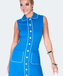The Retro 60s shift style dress has decorative contrast daisy buttons, edge detail, peter pan collar., collar, a high neckline, pockets with contrast trim, a flattering fit and it fastens with buttons at the front.