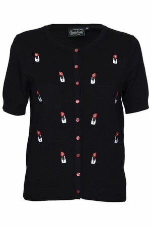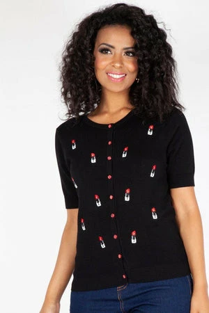 This cardigan has lipsticks embroidery, a round neckline, sleeves cut above elbow, rib hem and cuffs and it fastens at the front with contrast buttons.